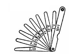又稱厚薄規(guī)或間隙片。主要用來檢驗機床特別緊固面和緊固面、活塞與氣缸、活塞環(huán)槽和活塞環(huán)、十字頭滑板和導板、進排氣閥頂和搖臂、齒輪嚙合間隙等兩個結合面之間的間隙大小。塞尺是由許多層厚薄不一的薄鋼片組成(圖)按照塞尺的組別制成一把一把的塞尺,每把塞尺中的每片具有兩個平行的測量平面,且都有厚度標記,以供組合使用