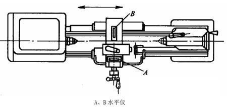 4、當(dāng)測量長度較大工件時,可將工件平均分若干尺寸段,用分段測量法,然后根據(jù)各段的測量讀數(shù),繪出誤差坐標(biāo)圖,以確定其誤差的大格數(shù)。如圖2所示。床身導(dǎo)軌在縱向垂直平面內(nèi)直線度的檢驗時,將方框水平儀縱向放置在刀架上靠近前導(dǎo)軌處(圖2中位置A),從刀架處于主軸箱一端的位置開始,從左向右移動刀架,每次移動距離應(yīng)近似等于水平儀的邊框尺(200mm)。依次記錄刀架在每一測量長度位置時的水平儀讀數(shù)。將這些讀數(shù)依次排列,用適當(dāng)?shù)谋壤嫵鰧?dǎo)軌在垂直平面內(nèi)的直線度誤差曲線。水平儀讀數(shù)為縱坐標(biāo),刀架在起始位置時的水平儀讀數(shù)為起點,由坐標(biāo)原點起作一折線段,其后每次讀數(shù)都以前折線段的終點為起點,畫出應(yīng)折線段,各折線段組成的曲線,即為導(dǎo)軌在垂直平面內(nèi)直線度曲線。曲線相對其兩端連線的大坐標(biāo)值,是導(dǎo)軌全長的直線度誤差,曲線上任一局部測量長度內(nèi)的兩端點相對曲線兩端點的連線坐標(biāo)差值,也是導(dǎo)軌的局部誤差。